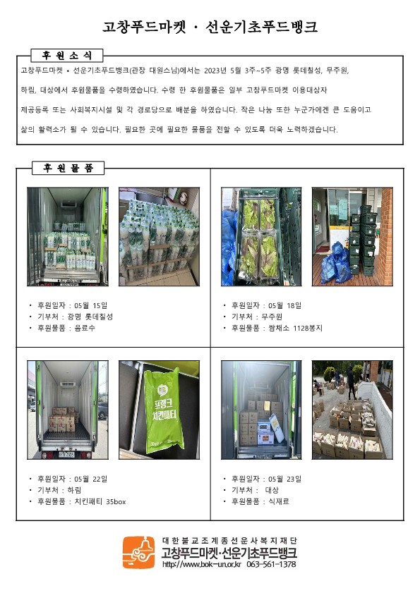 푸드마켓 & 푸드뱅크 2023년 5월 3~5주 후원 소식입니다. 페이지 정보 작성자고창복지관 댓글 0건 조회 1,012회 작성일 23-05-31 13:45 본문 푸드마켓 & 푸드뱅크 2023년 5월 3~5주 후원 소식입니다. 목록 이전글푸드마켓 & 푸드뱅크 2023년 6월 1~3주 후원 소식입니다. 23.06.20 다음글푸드마켓 & 푸드뱅크 2023년 5월 1~2주 후원 소식입니다. 23.05.17 댓글목록 댓글목록 등록된 댓글이 없습니다.